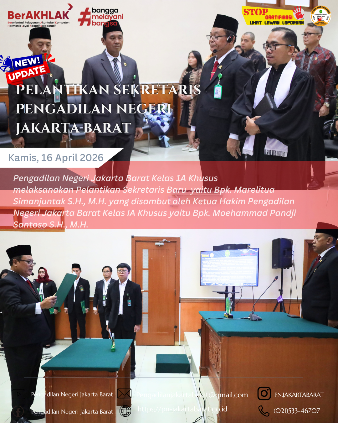 Jakarta - 16 April 2026, Bertempat di Ruang Sidang Utama Kusumah Atmadja Pengadilan Negeri Jakarta Barat Kelas IA Khusus dilaksanakan Acara Pelantikan dan Pengambilan Sumpah Jabatan Bpk. MARELITUA SIMANJUNTAK, S.H., M.H. sebagai Sekretaris Pengadilan Negeri Jakarta Barat Kelas IA Khususyang dipimpin oleh Ketua Pengadilan Negeri Jakarta Barat Kelas IA Khusus Bpk. MOEHAMMAD PANDJI SANTOSO S.H., M.H. yang dihadiri oleh Seluruh Hakim, Pejabat Struktural, Pejabat Fungsional, Aparatur Sipil Negera, PPNPN dan Outsourcing Pengadilan Negeri Jakarta Barat Kelas IA Khusus serta Tamu Undangan dari Pengadilan Negeri Medan Kelas IA Khusus.