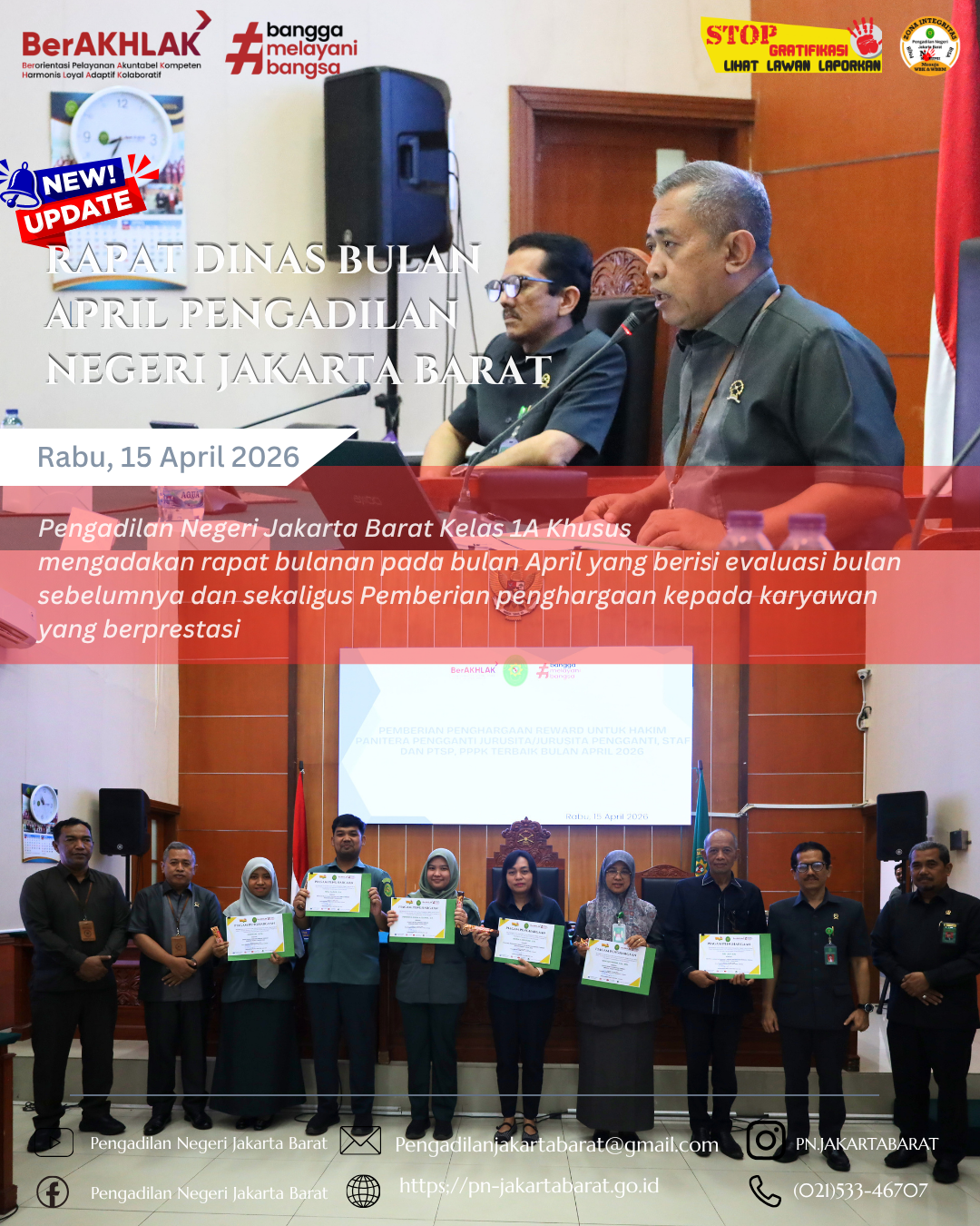 Jakarta - 15 April 2026, Bertempat di Ruang Sidang Utama Kusumah Atmadja Pengadilan Negeri Jakarta Barat Kelas IA Khusus dilaksanakan Rapat Dinas Bulan April Tahun 2026. Rapat ini dipimpin langsung oleh Ketua Pengadilan Negeri Jakarta Barat Kelas IA Khusus Bpk. Moehammad Pandji Santoso S.H, M.H. dan Wakil Ketua Bpk. Mateus Sukusno Aji, S.H., M.Hum serta dihadiri oleh Seluruh Hakim, Pejabat Sturktural, Pejabat Fungsional, Aparatur Sipil Negera, PPNPN dan Outsourcing Pada Pengadilan Negeri Jakarta Barat Kelas IA Khusus.