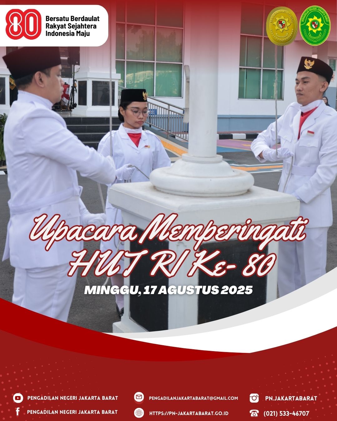 Pengadilan Negeri Jakarta Barat Kelas IA Khusus melaksanakan Upacara Memperingati HUT Republik Indonesia ke-80. Upacara di pimpin oleh Wakil Ketua Pengadilan Negeri Jakarta Barat, Bapak Iwan Anggoro Warsita, S.H., M.Hum., sebagai Inspektur Upacara, didampingi oleh Pembaca Naskah Proklamasi, Bapak Aslan Ainin, S.H., M.H., Ajudan, Ade Rosadi, S.H., Komandan Upacara, Bapak Mangaranap Simamora, S.H., M.H., Pemandu Acara (MC) Ibu Shanti Haryanti, S.Kom., Petugas pengibar bendera adalah, Bapak Deden Kusdinar, S.H., Ibu Nada Lestari Sihombing, S.H., Bapak Miftah Farid, A.Md., Pembacaan pembukaan UUD 1945 oleh Bapak Asa Septian Adi, S.H., serta pembacaan doa oleh Bapak Mohamad Sayuti Beroeh, S.Kom.